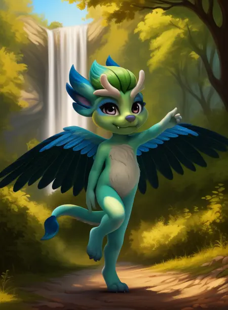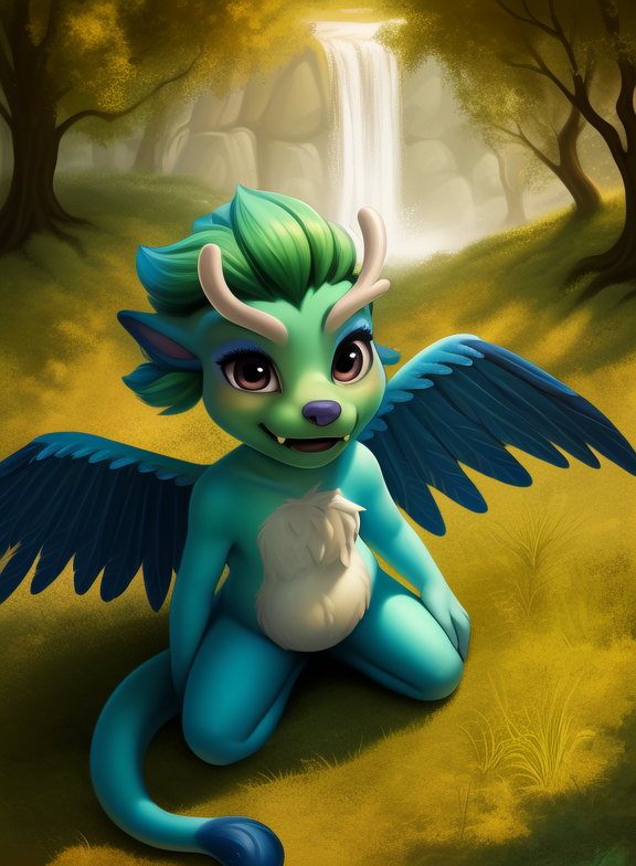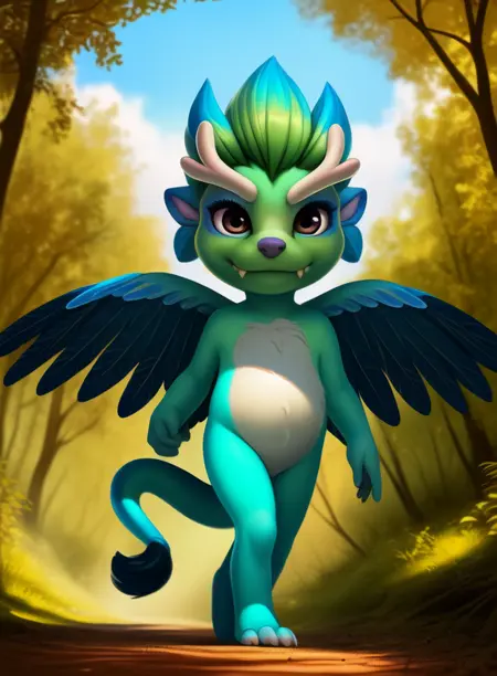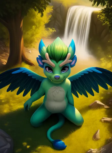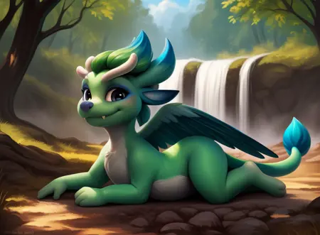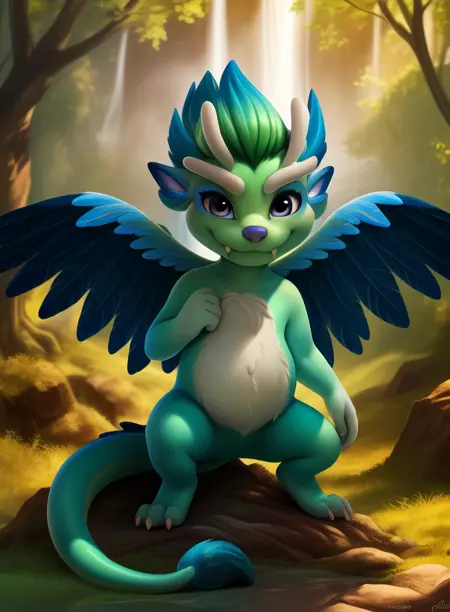 HeavenBeastSeaElv, dragon, wings, red eyes, white belly, fangs, purple nose, green skin, chibi, small body,(tail, tassel tail), blue eye makeup,