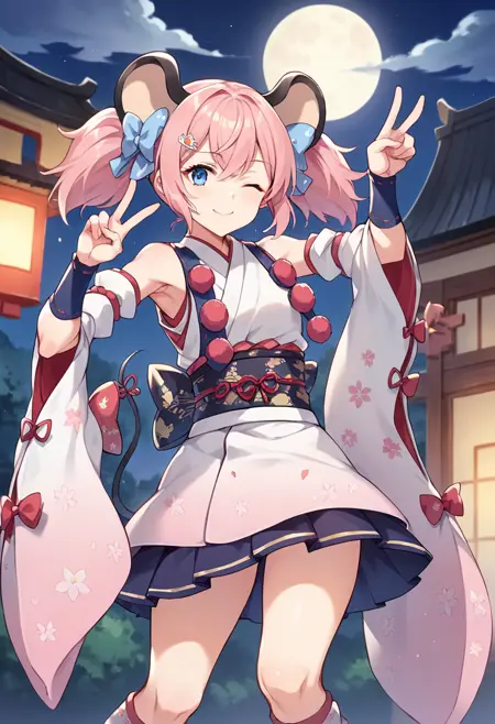 분홍색 머리, 동물 귀, 파란 눈, 쥐 귀, 더블 테일, 꼬리, 쥐 꼬리, 머리 장식, 머리 리본