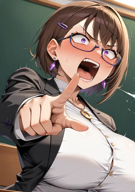 "huge breasts,brown hair, purple eyes,short hair,bangs"