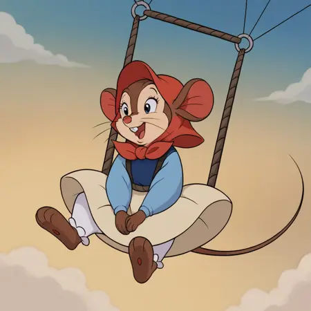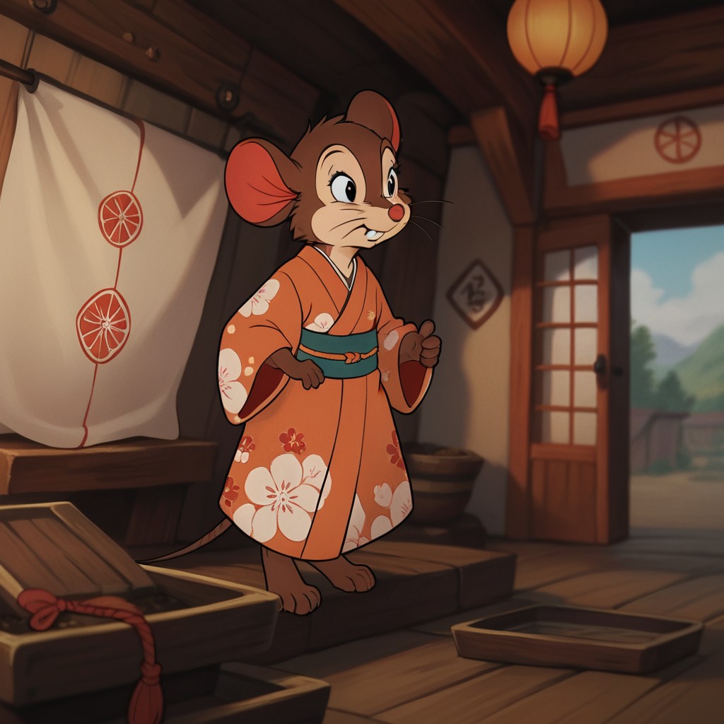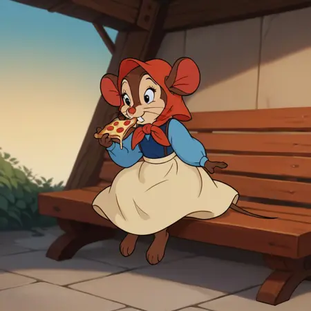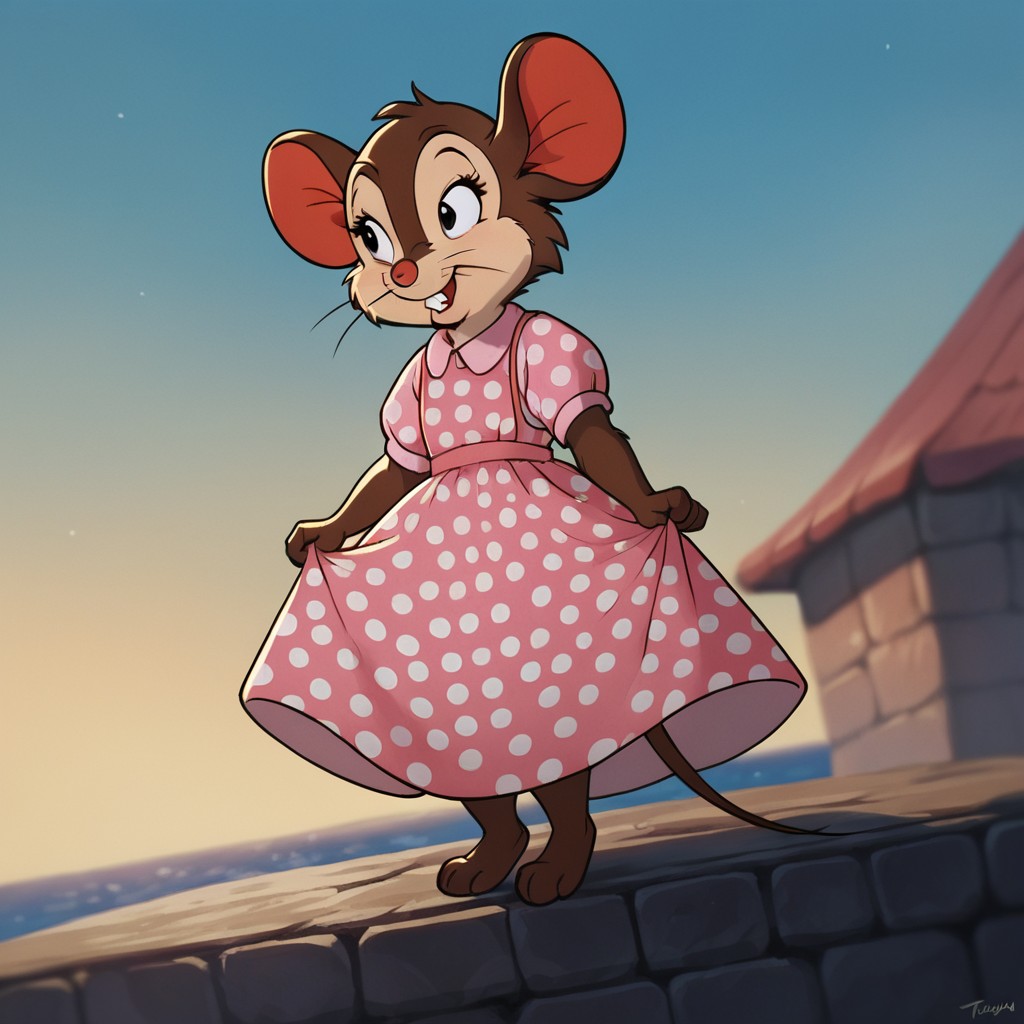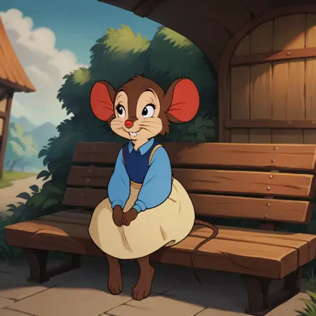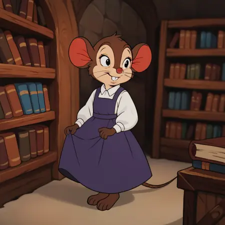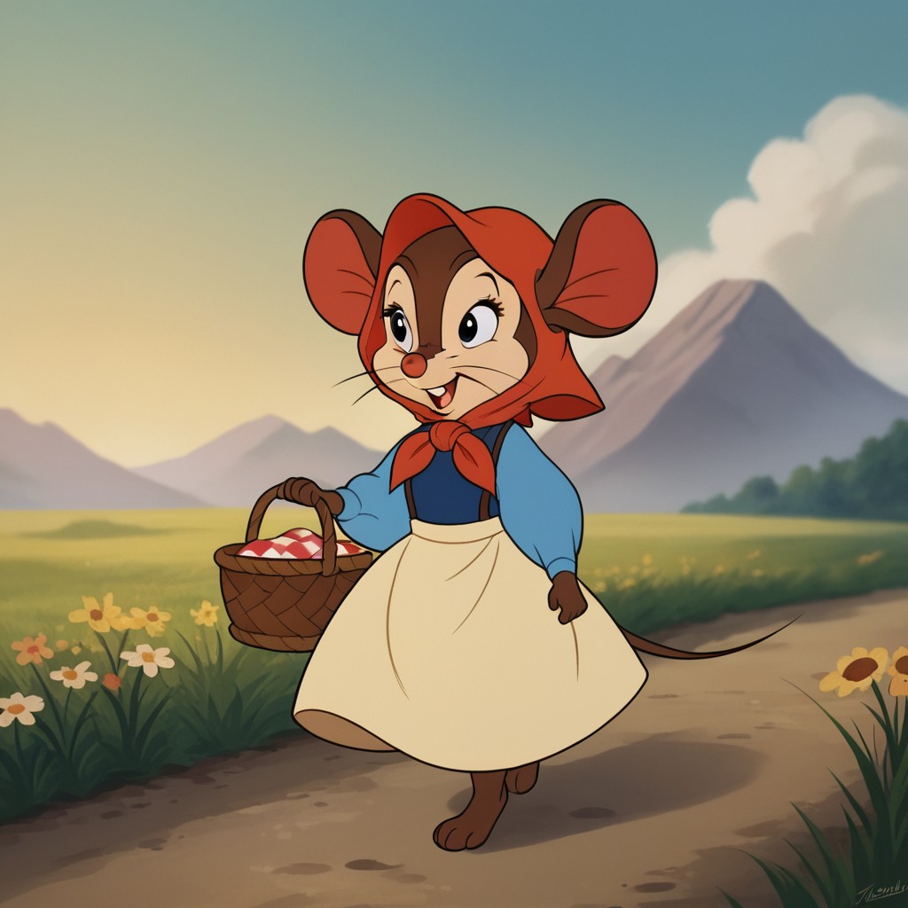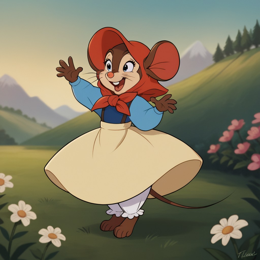 tanyaM, anthro, female, mouse, brown fur, black eyes, buckteeth, whiskers, young anthro, red nose, blue top, yellow skirt, frilly white ankle-length pantalettes, red headkerchief