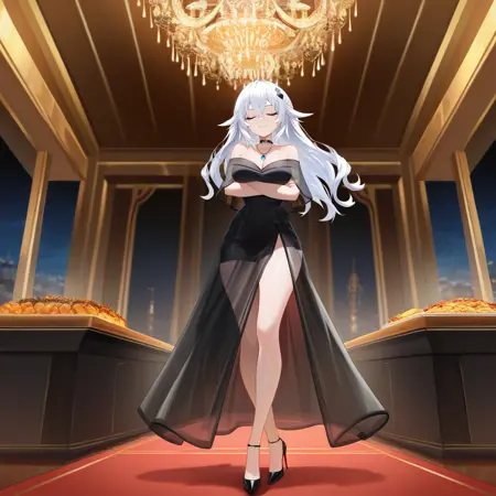BLH_Formal, 黑色连衣裙, 吊颈连衣裙, 暴露胸部, 黑色短披肩, 透明短披肩, 侧开衩, 透明裙子, 长裙, 黑色裙子, 露肩, 肘部手套, 黑色手套, 项链, 黑色项圈,