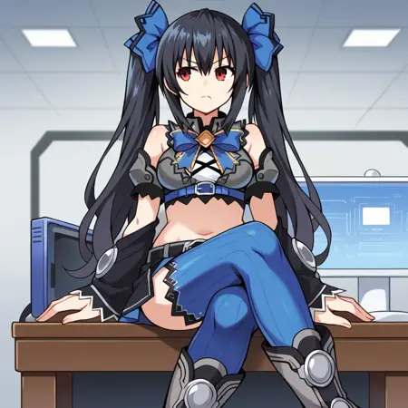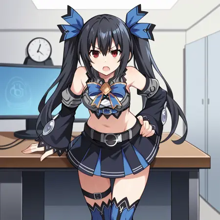 NoireNep, Fol001, Nre_Alt, noire (neptune series), black hair, twintails, long hair, red eyes, crop top, grey shirt, white undershirt, criss-cross strings, sleeveless shirt, black belt, blue underbust, midriff, navel, miniskirt, black skirt, skirt, arm guards, hair ornament, black trim, black detached sleeves, wide sleeves, black sleeves, arm strap, white gemstone, ribbed thighhighs, dark blue thighhighs, gradient thighhighs, thigh belt, black straps,