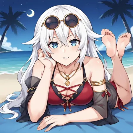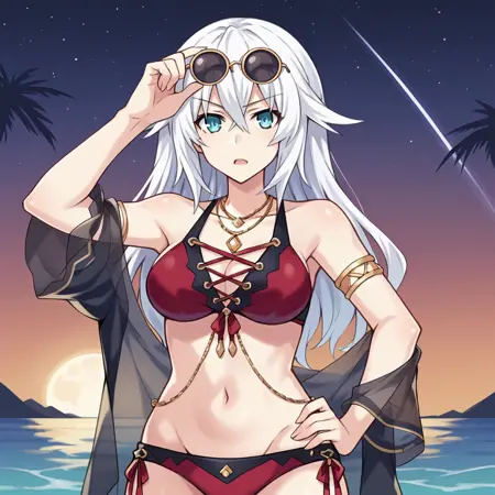NoireCPU, Fol102, Nbh_Rbk, white hair, black heart, long hair, red bikini, black trim, aqua eyes, cross-laced bikini, black shawl, see-through shawl, red sandals, ankle lace-up, gold armlet, red ribbon, front-tie bikini, side-tie bikini bottom, sunglasses, round eyewear, eyewear on head, cleavage, multiple necklaces,