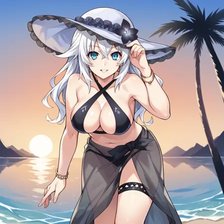 NoireCPU, Fol202, Nbh_Bik, white hair, black heart, long hair, aqua eyes, halter top bikini, criss-cross halter, black bikini, see-through sarong, black sarong, bracelet, black thighlet, frilled hat, light blue headwear, sun hat, hat flower, cross-laced sandals, black sandals,