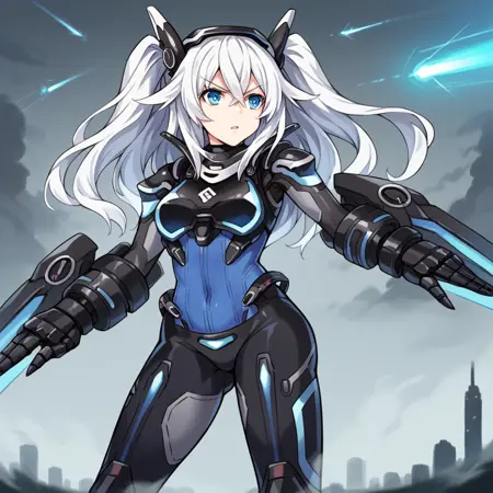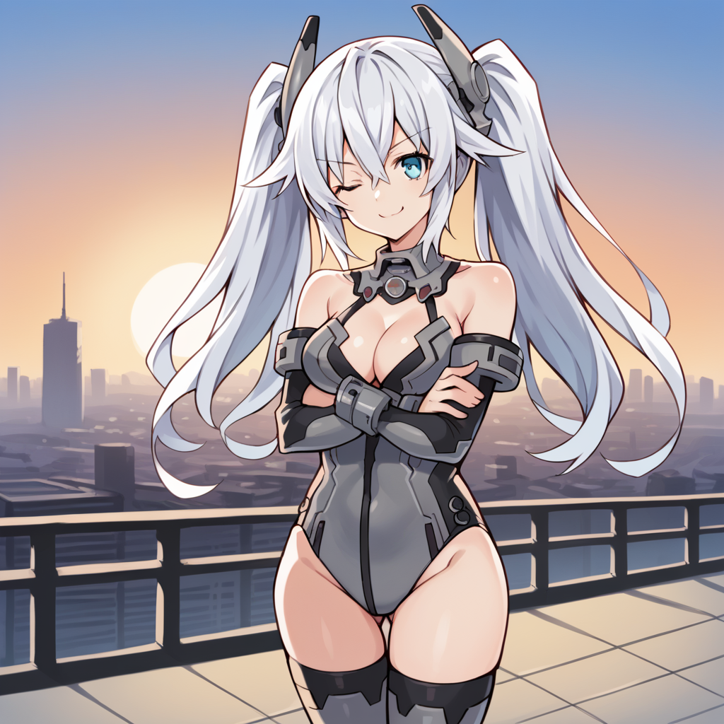 NoireCPU, Fol201, Nbh_Alt, 吊颈装, 双马尾, 白发, 黑色心形, 长发, 水蓝色眼睛, 分离式衣领, 灰色衣领, 吊颈紧身衣, 灰色紧身衣, 黑色镶边, 灰色头饰, 灰色分离式袖子, 装甲袖子, 黑色手套, 手套, 灰色大腿靴, 灰色鞋履, 肘部手套,