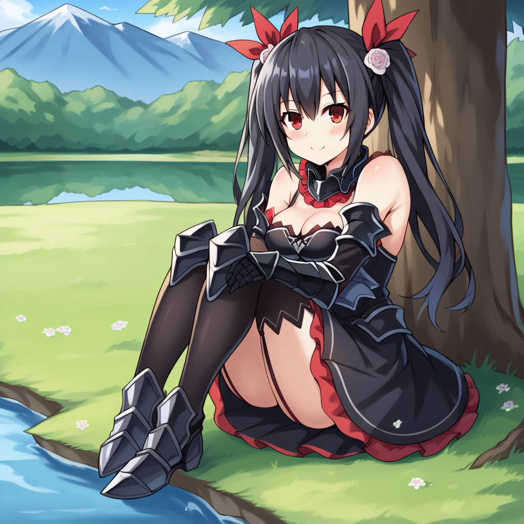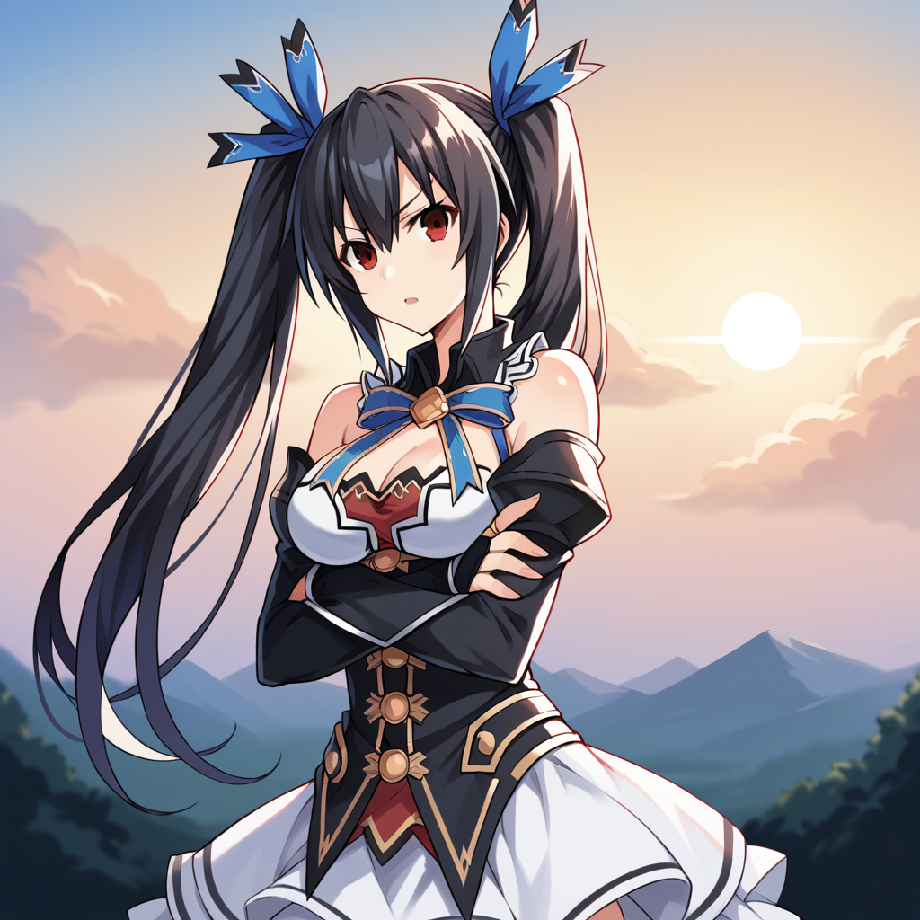 NoireNep, Fol001, Nre_Adv, noire (neptune series), black hair, twintails, long hair, red eyes, red ribbon, hair ribbon, halterneck, armored dress, black dress, detached collar, black armor, arm armor, black gauntlets, black sleeves, black gloves, bare shoulders, greaves, red skirt, layered skirt black skirt, frilled collar, armored collar, cleavage, black garter straps, black thighhighs, knee boots, black armored boots, black knee pads, silver trim,