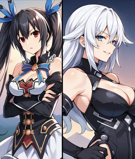 NoireCPU, Fol101, Nbh_Def, white hair, black heart, long hair, aqua eyes, sleeveless turtleneck leotard, black leotard, cleavage cutout, bare shoulders, thigh boots, black legwear, black gauntlets, white trim, detached sleeves, black sleeves, long sleeves, upper arm bracelet,
