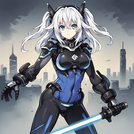 NoireCPU, Fol101, Nbh_Nxt, white hair, black heart, long hair, aqua eyes, armored bodysuit, blue bodysuit, covered navel, neon trim, chestplate, underboob, armored collar, turtleneck bodysuit, mechanical gauntlets, black armor, mechanical gloves, shoulder armor, black headgear, mechanical boots, mechanical wings, black knee boots, black leggings,