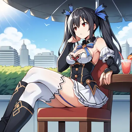 NoireNep, Fol001, Nre_Def, noire (neptune series), black hair, twintails, long hair, red eyes, black corset, corset, white top, strapless, bare shoulders, detached collar, detached sleeves, blue bowtie, frilled sleeves, white sleeves, short sleeves, elbow gloves, black gloves, black bridal gauntlets, frilled skirt, white skirt, white gemstone, blue ribbon, ribbon bow, hair ribbon, back bow, blue bow, blue garter straps, white thighhighs, thighhighs under boots, black thigh boots,