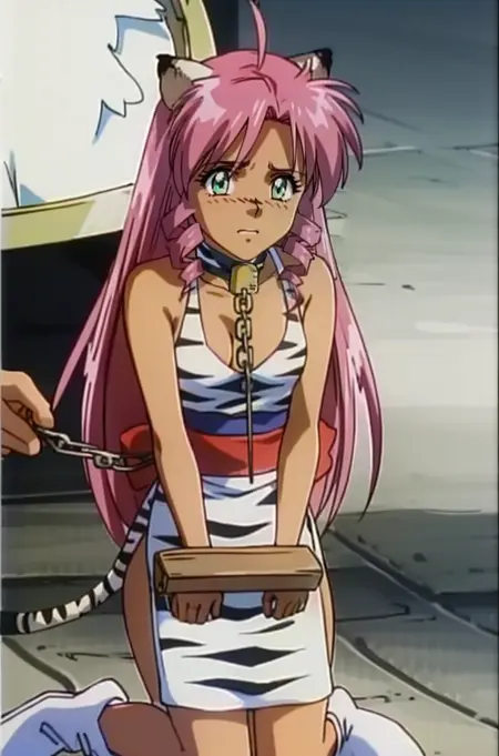 ((白色老虎耳朵), (白色老虎尾巴), 长发, 粉色头发, 侧辫, 绿色眼睛, 小胸部, 项圈, 铃铛)