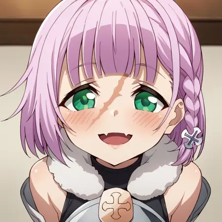 braid, scar, cross hair ornament, skin fang