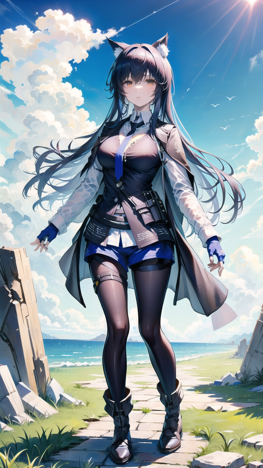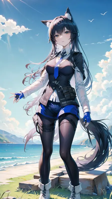 -->Prompts: aktx, 1girl, texas (arknights), solo, pantyhose under shorts, animal ears,long hair, black vest, pantyhose, shorts, black hair, boots, blue gloves, black pantyhose, shirt, necktie, white footwear, wolf ears, gloves, blue necktie, white shirt, long sleeves, vest, coat, blue shorts, collared shirt, wolf girl, fingerless gloves, jacket, bangs, black coat, brown eyes, breasts, legwear under shorts, black jacket