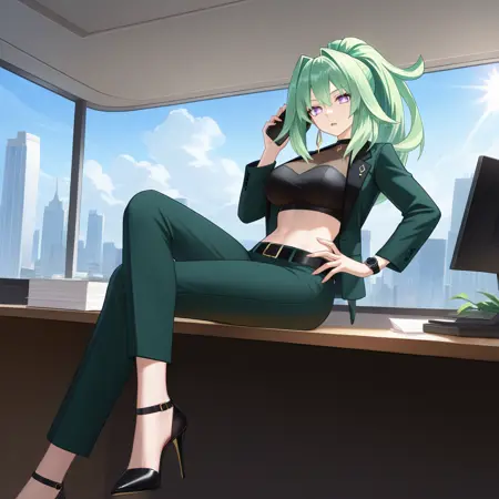 VertCPU, Grh_Lmg, long hair, purple eyes, green hair, green heart, ponytail, strapless shirt, black crop top, bandeau, see-through cleavage, covered collarbone, black choker, midriff, single earring, dark green jacket, suit jacket, black belt, dark green pants, dress pants, black strappy heels, black wristwatch, closed jacket,