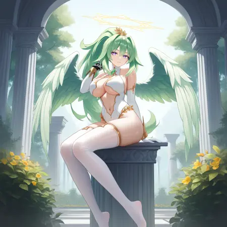 VertCPU, Grh_Ang, purple eyes, green hair, green heart, ponytail, sleeveless turtleneck leotard, angel, bare shoulders, gold trim, green gemstone, elbow gloves, white gloves, white thighhighs, thighhighs, navel, leaf hair ornament, halo, feathered wings, light green wings, clothing cutout, white leotard, jewelry, mechanical gauntlets, open leotard, center cutout,