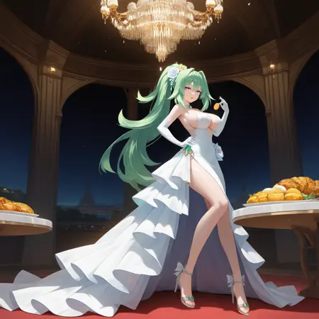 VertCPU, Grh_Whd, long hair, purple eyes, green hair, green heart, ponytail, strap dress, side slit, white dress, long dress, white rose, veil, hair flower, yellow flower, long gloves, white gloves, white high heel sandals, alt jewelry, bare shoulders, sideboob, cleavage, white pendant choker, green jewel,
