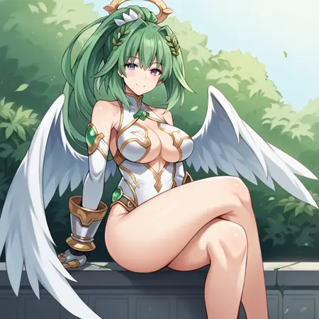 VertCPU, Grh_Ang, 紫色眼睛, 绿发, 绿色心形, 马尾辫, 无袖高领紧身衣, 天使, 裸露肩膀, 金色镶边, 绿色宝石, 肘部手套, 白色手套, 白色大腿袜, 大腿袜, 肚脐, 叶片发饰, 光环, 羽翼, 浅绿色翅膀, 服装开叉, 白色紧身衣, 饰品, 机械护腕, 开放式紧身衣, 中间开叉,