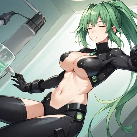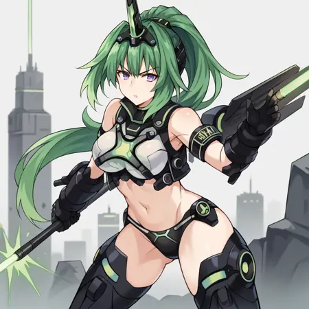 VertCPU, Grh_Alt, 马尾辫, 长发, 紫色眼睛, 绿发, 绿色心形, 连体衣, 霓虹镶边, 中间开叉, 下乳, 侧乳, 透胸, 肚脐, 大腿开叉, 黑色盔甲, 灰色袖子, 纹理袖子, 防护袖子, 黑色护腕, 黑色领子, 黑色腿装, 机械靴, 黑色鞋履, 黑色连体衣, 透胸开叉,