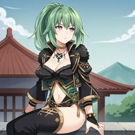 VertCPU, Grh_JP, 长发, 紫色眼睛, 绿发, 绿色心形, 日本服饰, 毛皮镶边紧身衣, 黑色紧身衣, 衣物下紧身衣, 黑色毛皮镶边, 橙色流苏, 替代金色镶边, 肚脐开叉, 毛皮镶边胸罩, 多条腰带, 交叉腰带, 黑色腰带, 饰品, 毛皮镶边夹克, 高领, 下胸, 短夹克, 金色手镯, 黑色夹克, 发饰, 项链, 蓬松长袖, 袖子超过肘部, 黑色新娘护腕, 透胸, 胸部中间, 颈部流苏, 分离式裤子, 深绿色裤子, 渐变裤子, 黑色格栅带, 木屐, 黑色袜子,