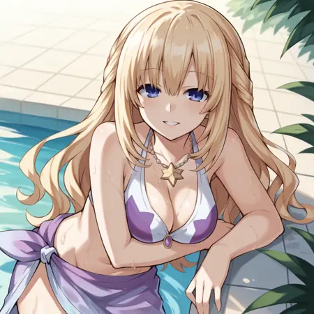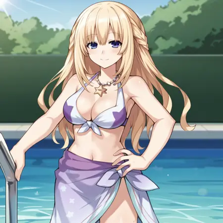 VertNep, Fol001, Vrt_Bik, vert (neptune系列), 金发, 蓝眼, 长发, 法式编发, 白色比基尼, 比基尼, 前系带比基尼, 比基尼印花, 紫色星星图案, 露脐, 肚脐, 紫色纱笼, 渐变纱笼, 手镯, 项链, 人字拖, 鞋面花朵,