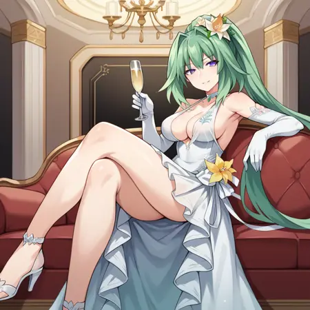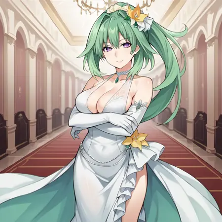 VertCPU, Grh_Whd, 长发, 紫色眼睛, 绿发, 绿色心形, 马尾辫, 肩带连衣裙, 侧开叉, 白色连衣裙, 长裙, 白色玫瑰, 面纱, 发花, 黄色花朵, 长手套, 白色手套, 白色高跟凉鞋, 替代饰品, 裸露肩膀, 侧乳, 透胸, 白色吊坠项圈, 绿色宝石,