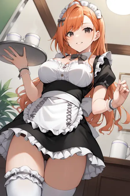 natsuhaarisugawa, 1girl, solo, orange hair, long hair, ahoge, swept bangs, black eyes, large breasts, cleavage, maid, enmaided, black dress, frills, frilled dress, maid headdress, waist apron, frilled apron, white apron, detached collar, neck ribbon, grey ribbon, puffy sleeves, puffy short sleeves, short sleeves, wrist cuffs, white thighhighs, bridal garter