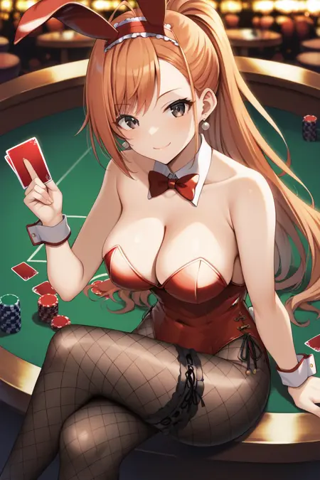 natsuhaarisugawa, 1girl, solo, orange hair, long hair, ponytail, ahoge, swept bangs, black eyes, large breasts, cleavage, playboy bunny, red leotard, strapless leotard, detached collar, red bowtie, red hairband, frilled hairband, fake animal ears, rabbit ears, rabbit tail, black pantyhose, fishnet pantyhose, bridal garter, earrings