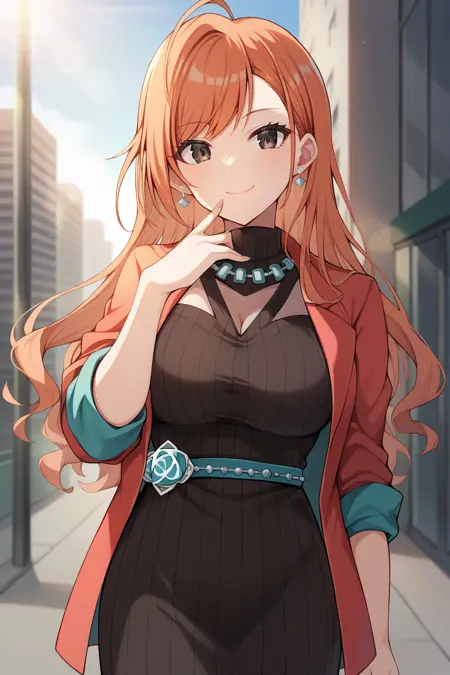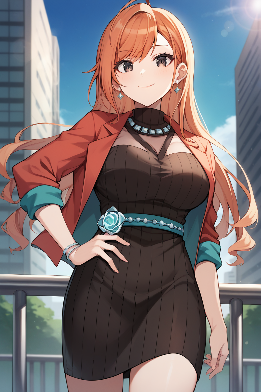 natsuhaarisugawa, 1girl, solo, orange hair, long hair, ahoge, swept bangs, black eyes, large breasts, cleavage, red jacket, open jacket, sleeves rolled up, black dress, short dress, ribbed dress, turtleneck, see-through cleavage, aqua belt, earrings, jewelry