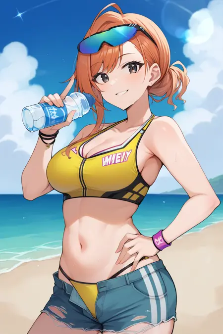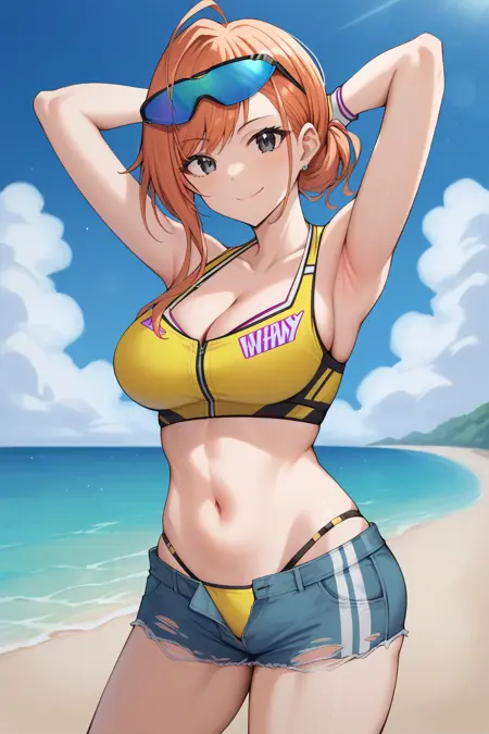 natsuhaarisugawa, 1girl, solo, orange hair, single hair bun, ahoge, swept bangs, black eyes, large breasts, cleavage, bikini, sports bikini, yellow bikini, layered bikini, sports sunglasses, tinted eyewear, blue-tinted eyewear, eyewear on head, blue shorts, denim shorts, cutoffs, open fly, wristband