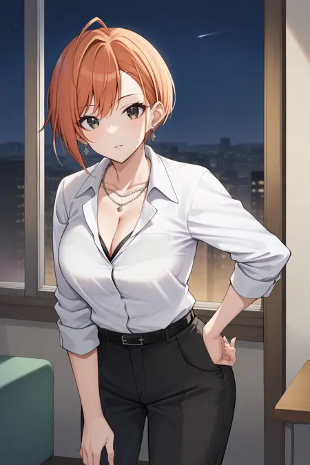 natsuhaarisugawa, 1girl, solo, orange hair, short hair, ahoge, swept bangs, black eyes, large breasts, cleavage, white shirt, collared shirt, long sleeves, black shirt, strapless, strapless shirt, black pants, black belt, necklace, earrings