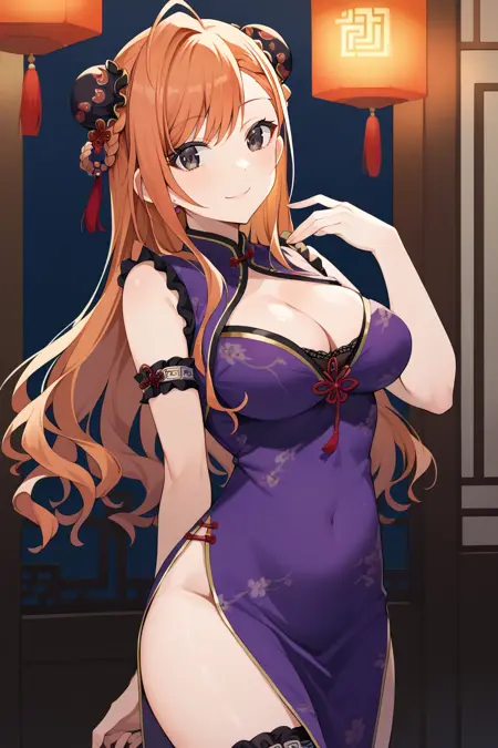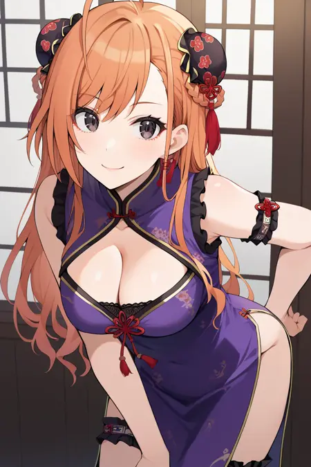natsuhaarisugawa, 1girl, solo, orange hair, long hair, ahoge, hair bun, double bun, bun cover, hair ornament, braid, swept bangs, black eyes, large breasts, cleavage, chinese clothes, china dress, purple dress, sleeveless dress, cleavage cutout, clothing cutout, arm garter, bridal garter