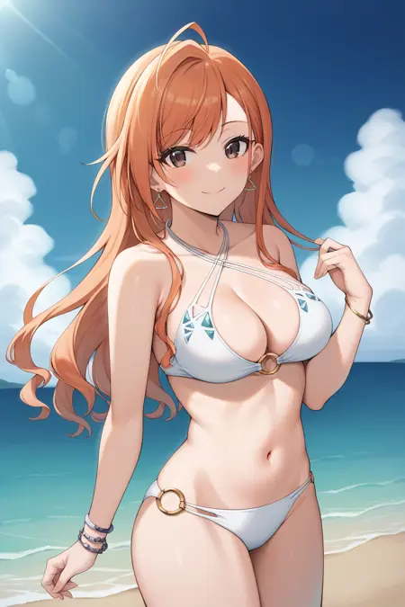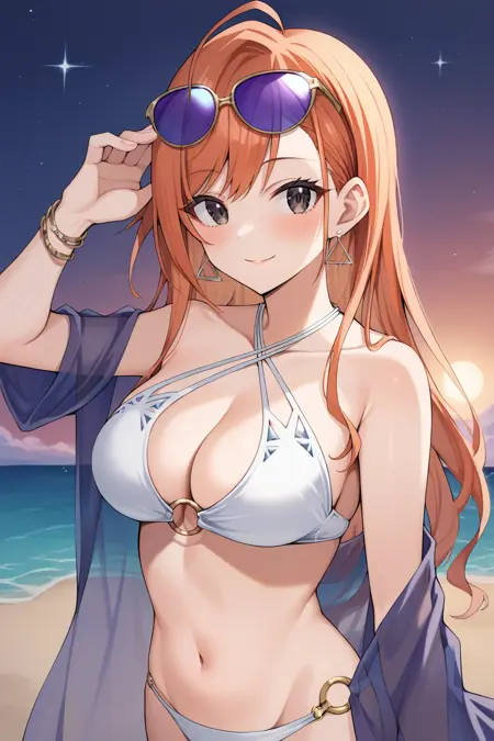 natsuhaarisugawa, 1girl, solo, orange hair, long hair, ahoge, swept bangs, black eyes, large breasts, cleavage, bikini, white bikini, criss-cross halter, o-ring, o-ring bikini, jewelry, triangle earrings, sunglasses, tinted eyewear, purple-tinted eyewear, eyewear on head, shawl, see-through, bracelet