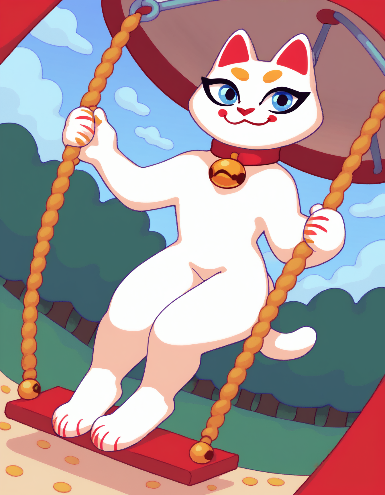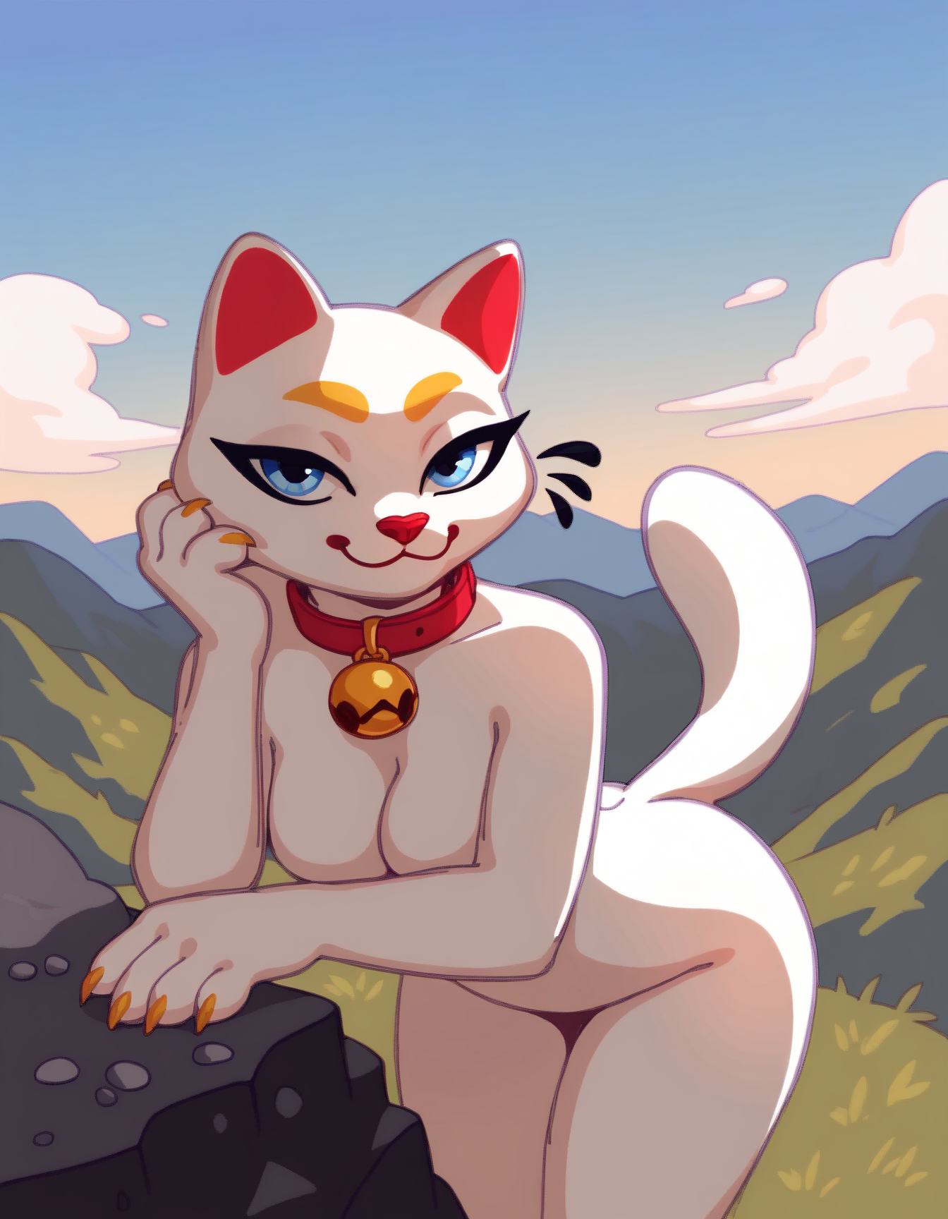 Kimi, white cat, red nose, red collar, blue eyes, white tail, yellow eyebrows, black eyelasher, red circles in jaw