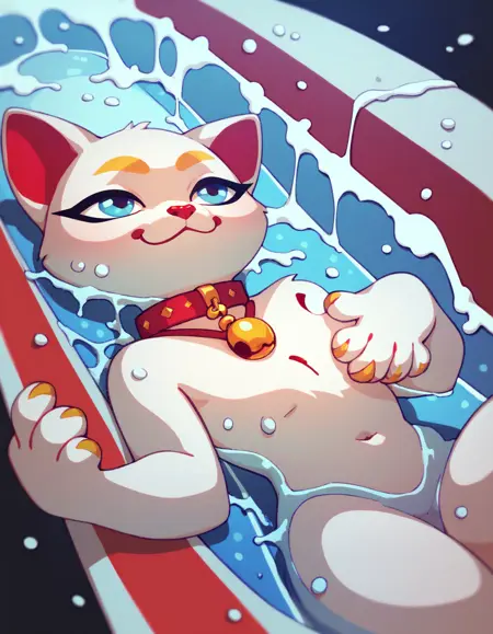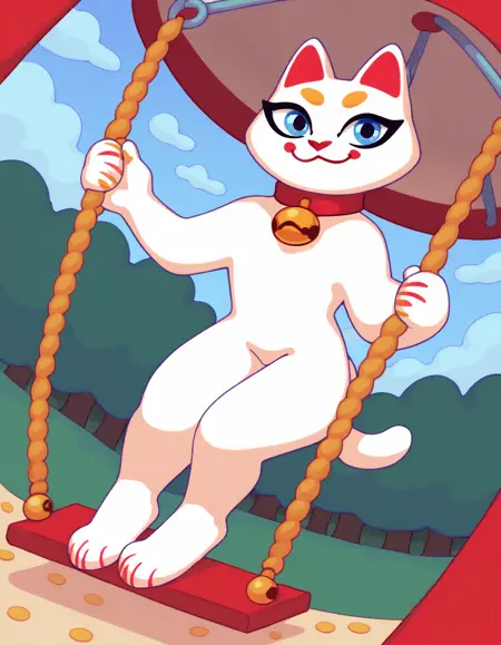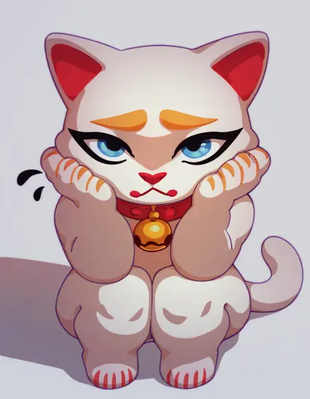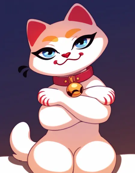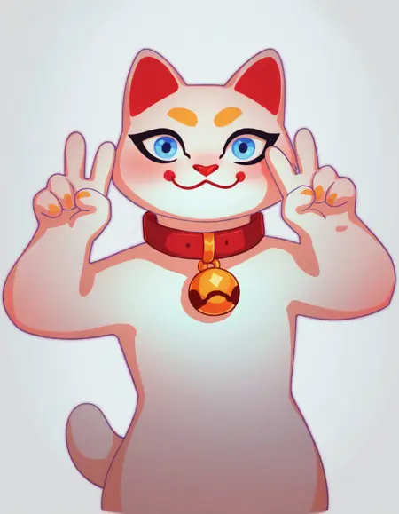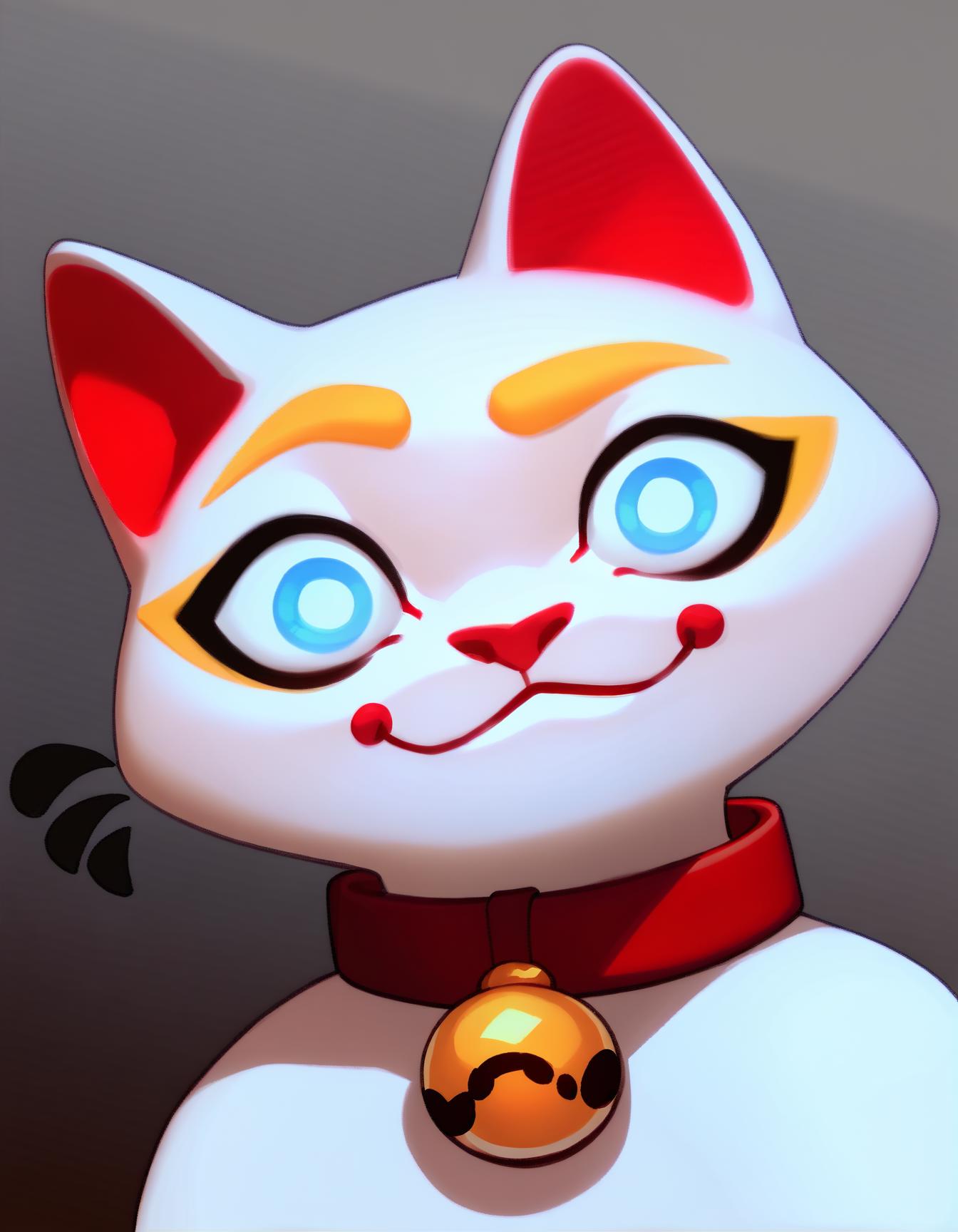 키미, 흰 고양이, 빨간 코, 빨간 목줄, 파란 눈, 흰 꼬리, 노란 눈썹, 검은 속눈썹, 턱에 빨간 원형.