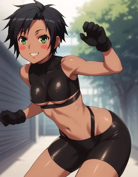 クズリ、短い髪、黒髪、へそ、緑の目、黒い手袋、お腹出し、クロップトップ、黒肌の女性、鼠径部、アンダーブーブ、頬のステッカー、自転車用ショーツ、