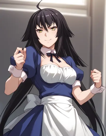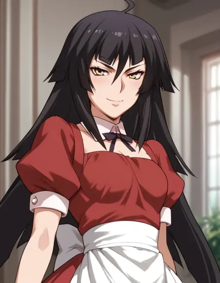 ヒビキ、長い髪、黒髪、黄色い目、アホ毛、メイド、赤いドレス、