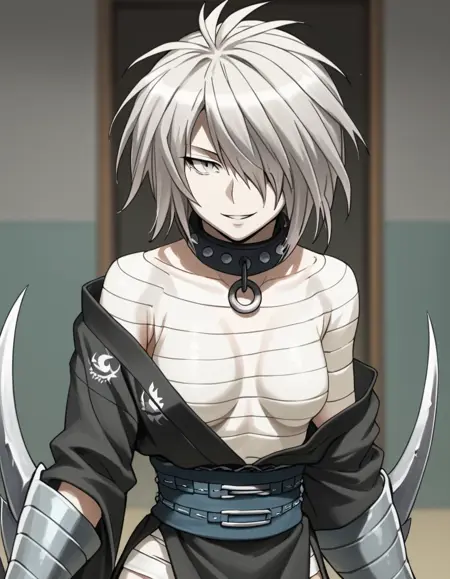 ハイハネ、短い髪、鎖骨、灰色の髪、開いた衣装、肩出し、片目を覆う髪、カラー、灰色の目、包帯、白い肌、スパイク、さらし、黒いカラー、片方の肩のみ露出、スパイクカラー、爪(武器)、骨盤カーテン、