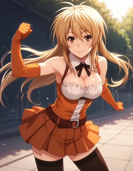 ナナハ、長い髪、金髪、胸元、肩出し、茶色の目、プリーツスカート、ベルト、黒いタイツ、肘まで手袋、ミニスカート、ゼッタイリョウイキ、