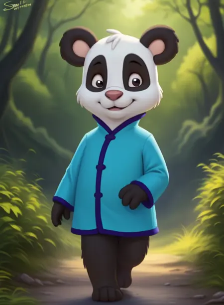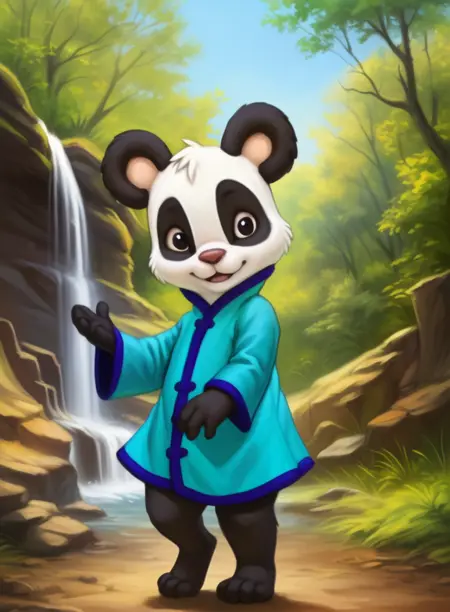 LingLingAmyRosMilPow, Panda, chibi, small body, blue robe with purple edges,