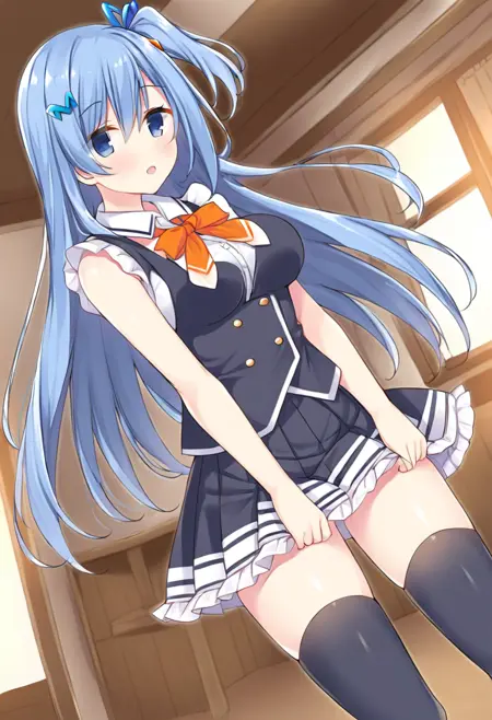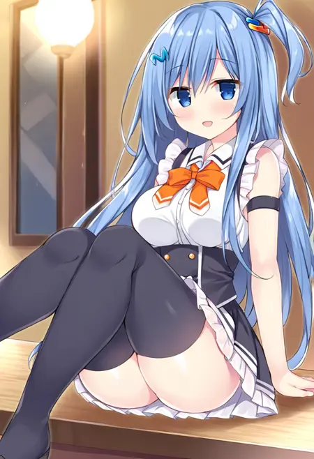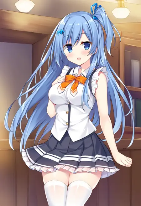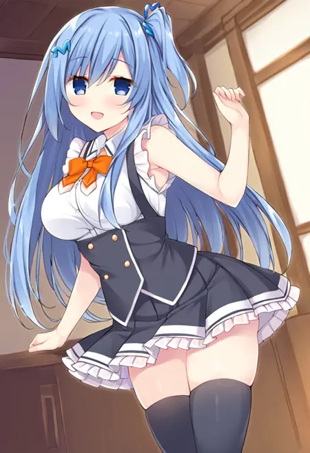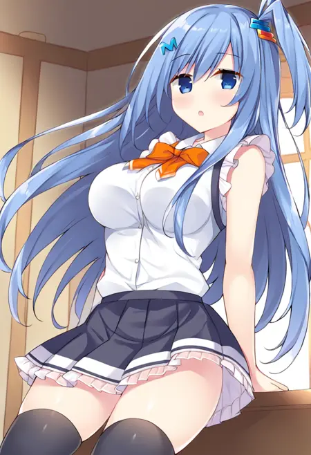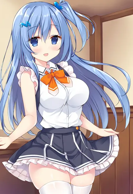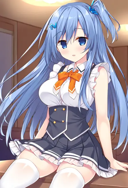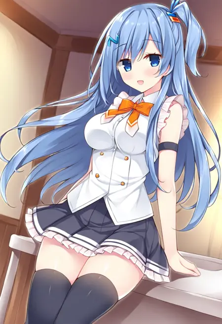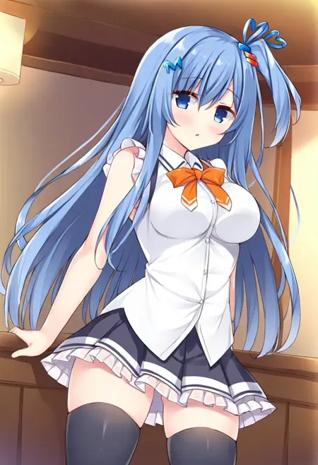 Outfit Prompts: white shirt, frills, bare shoulders, sleeveless, orange bow, frilled skirt, pleated skirt, black skirt, thighhighs