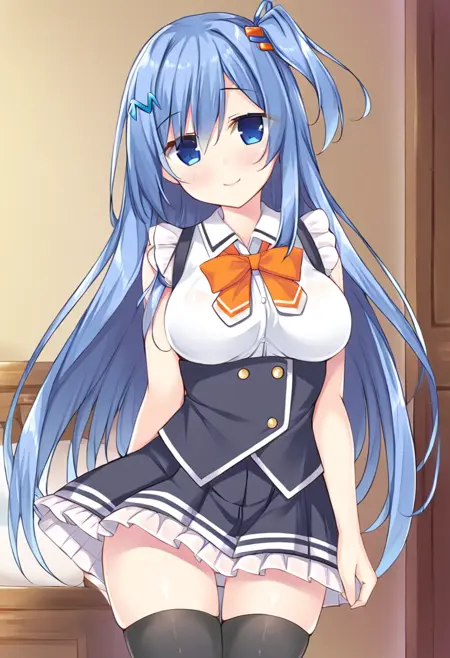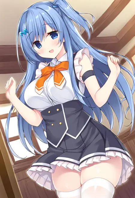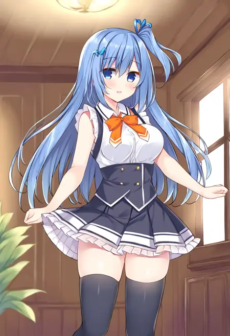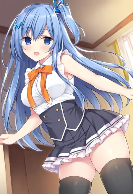 衣装プロンプト: 白いシャツ、フリル、肩出し、ノースリーブ、オレンジのリボン、フリル付きスカート、プリーツスカート、黒いスカート、タイツ