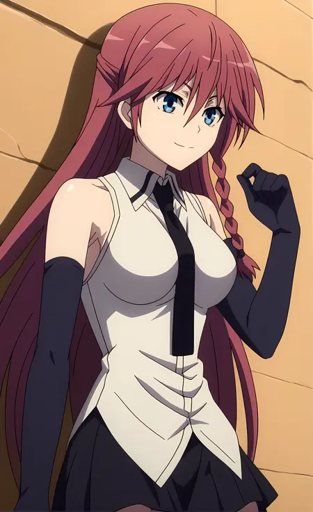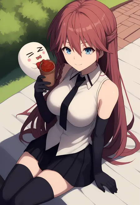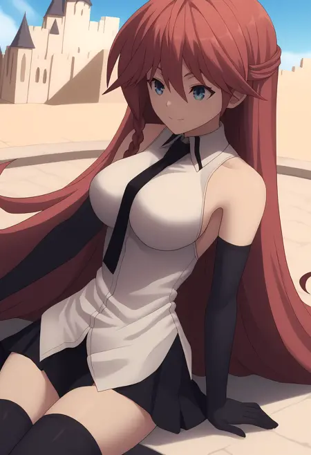 Outfit 2 → bare_shoulders, sleeveless, elbow_gloves, gloves, sleeveless_shirt, white_shirt, black_gloves, black_necktie, thighhighs, zettai_ryouiki, skirt, black_thighhighs,
