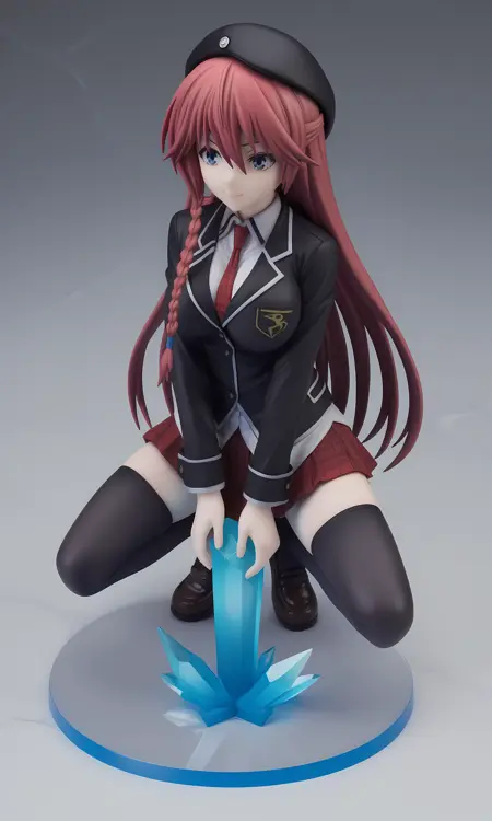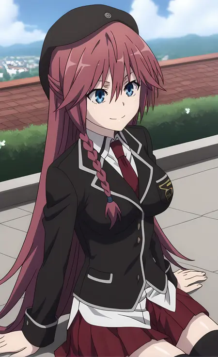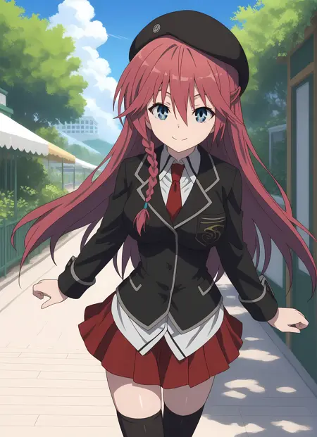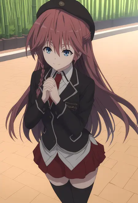 Outfit 1 → hat, beret, necktie, shirt, school_uniform, skirt, jacket, thighhighs, zettai_ryouiki, black_thighhighs,