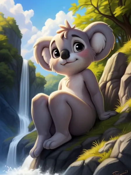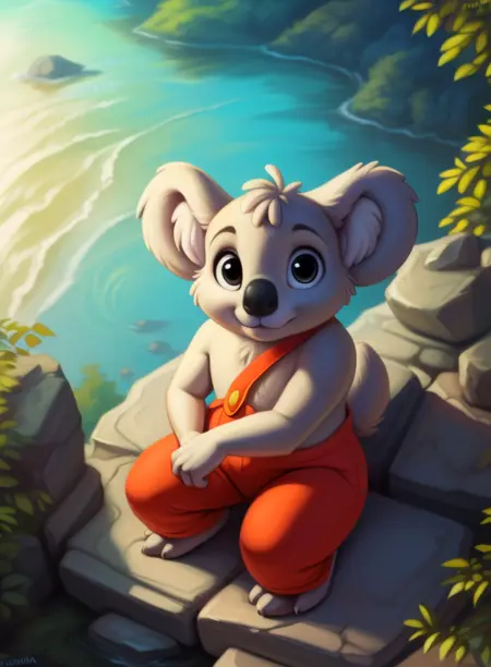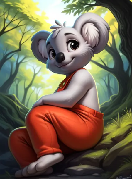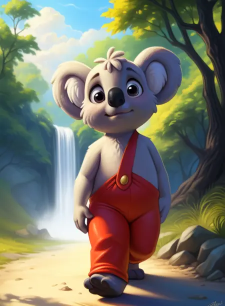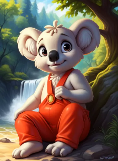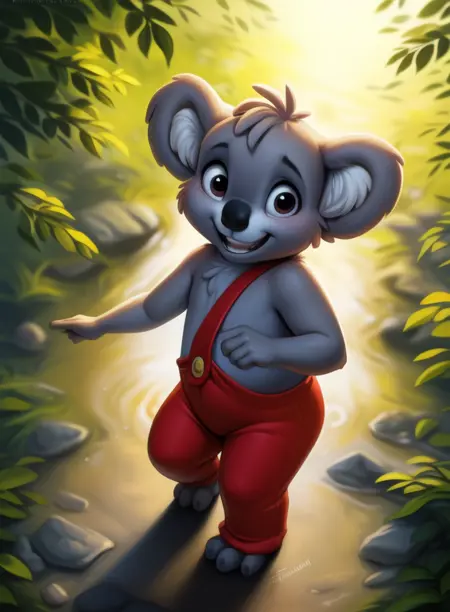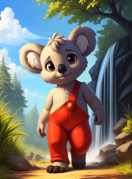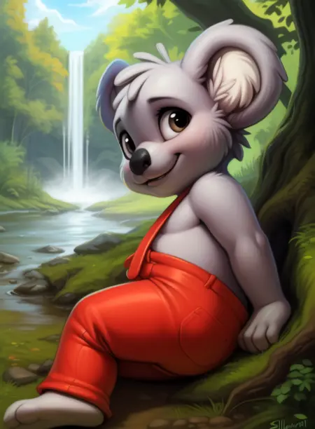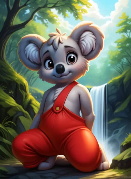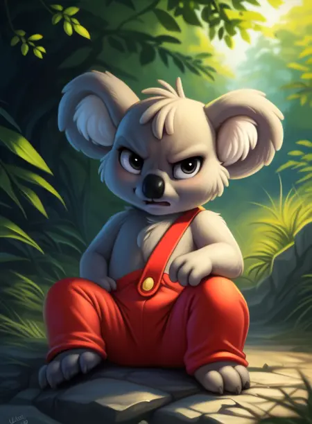 BlinkyBillAmyRosMilPowAro, koala, gray fur, chibi, small body, red pants with suspenders,