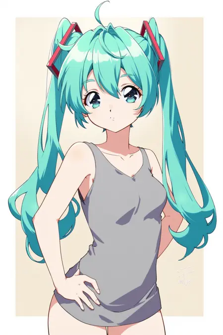 1990년대의 레트로 페인팅 스타일로, 크고 둥근 눈이 특징입니다. 전통적인 셀룰로이드 스타일과 유사한 평탄한 색상 표현을 사용합니다.