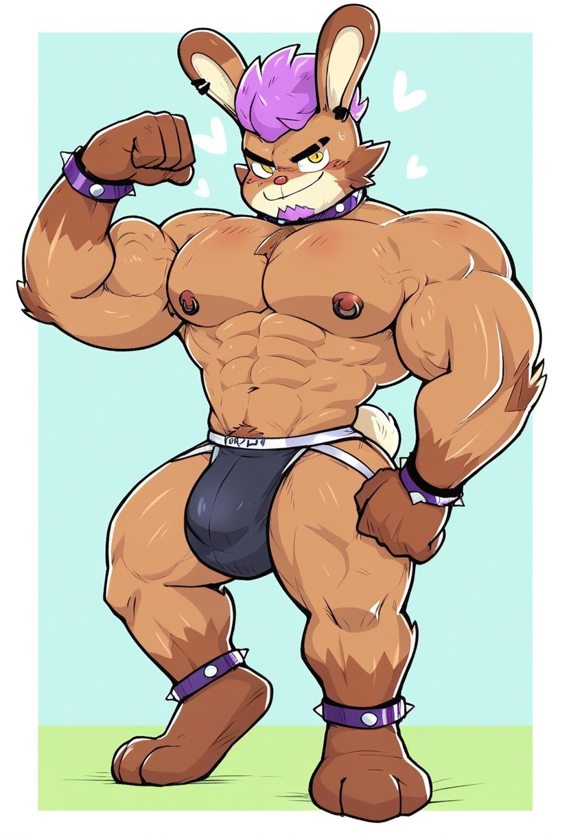 Munchy, rabbit boy, purple hair, brown fur, goatee, muscular male, furry male, rabbit ears,
