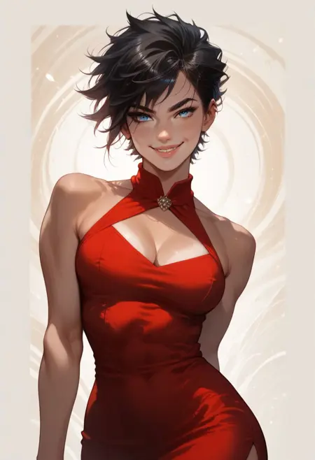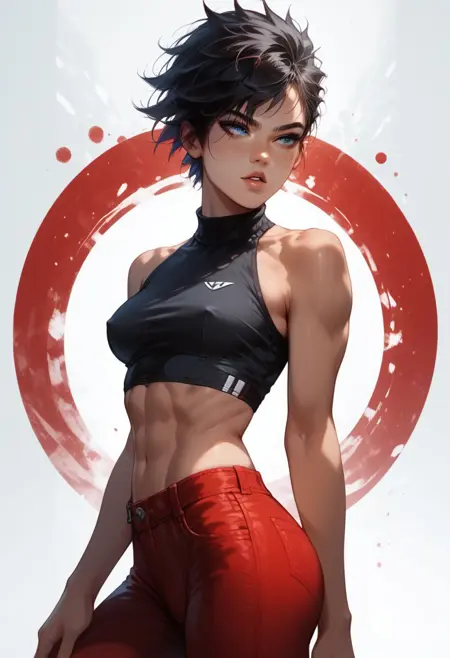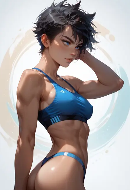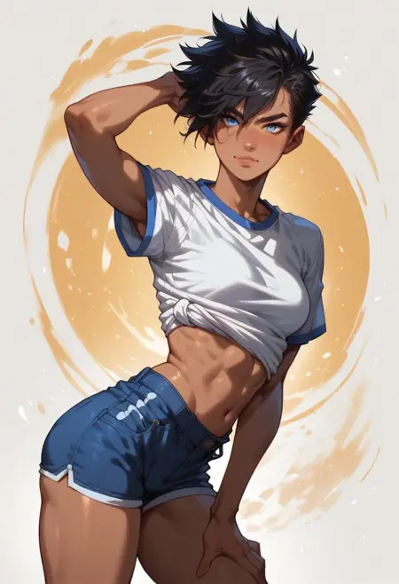 cute face, tomboy, short black hair, blue eyes, [freckles], tanned skin, small perky breasts, fit, toned , perfect butt