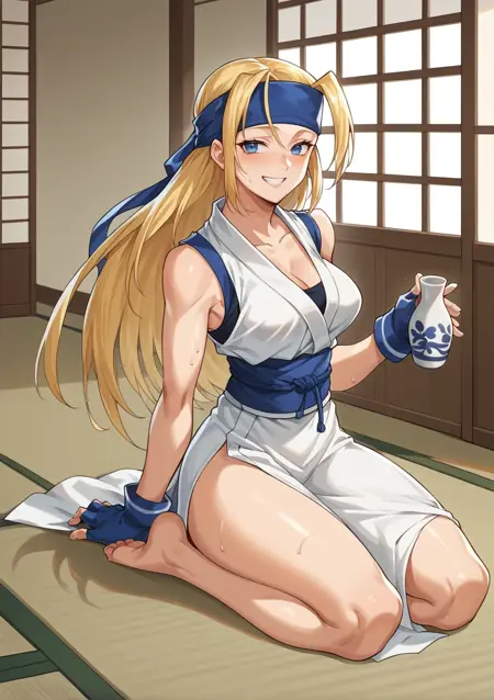 显著标签:长发、天线发、金发、蓝眼、发带、和服、无袖、腰带、露指手套、侧开衩、蓝色连裤袜