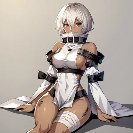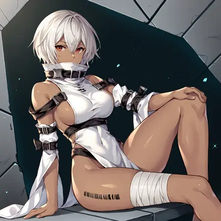 NoelleNier,短发,白色连衣裙,头发遮住眼睛,裸露肩膀,骨盆帘,白发,可拆卸袖子,深色皮肤女性,宽袖,条形码纹身,侧乳,腿部缠绷带