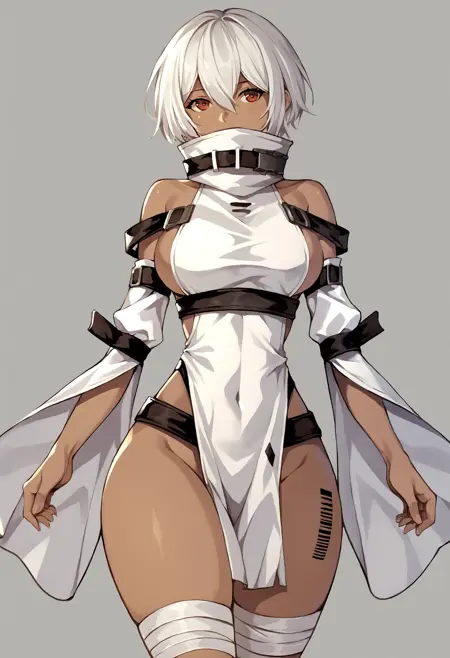 NoelleNier, 단발, 흰 드레스, 눈 사이의 머리카락, 어깨 드러난, 골반 커튼, 흰 머리카락, 분리된 소매, 검은 피부를 가진 여자, 넓은 소매, 바코드 문신, 사이드보브, 붕대 감은 다리