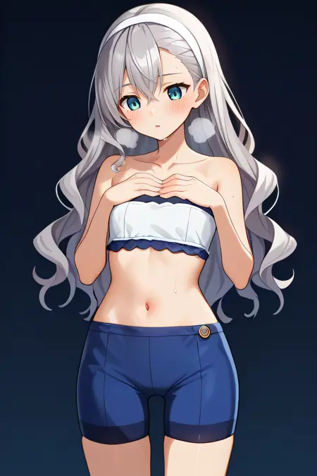 scarf, white tube top, blue jacket, sleeveless, cropped jacket, fingerless gloves, bike shorts